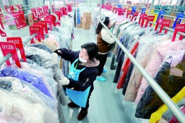在淮北市烈山區(qū)烈山鎮(zhèn)土型社區(qū)潔風(fēng)工廠,工人正在對全國各地發(fā)來的包裹進行分揀,“有的需要水洗,有的需要干洗,有的需要低溫洗……”工人手腳麻利,幾秒鐘便可完成一件衣服的分類。