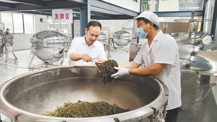 6月22日,湖北省十堰市鄖西縣澗池鄉(xiāng)下營村,湖北七夕茶業(yè)生物科技有限公司生產(chǎn)車間。烘干機(jī)的高溫慢慢蒸發(fā)掉茶葉的水分,車間里茶香氤氳。