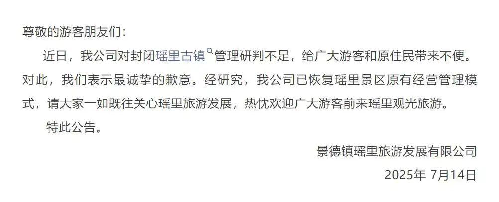 在村民的反對和輿論關注下,7月14日,江西省景德鎮(zhèn)市瑤里景區(qū)發(fā)布公告稱,近日,我公司對封閉瑤里古鎮(zhèn)管理研判不足,給廣大游客和原住民帶來不便。對此,我們表示最誠摯的歉意。經研究,我公司已恢復瑤里景區(qū)原有經營管理模式,請大家一如既往關心瑤里旅游發(fā)展,熱忱歡迎廣大游客前來瑤里觀光旅游。