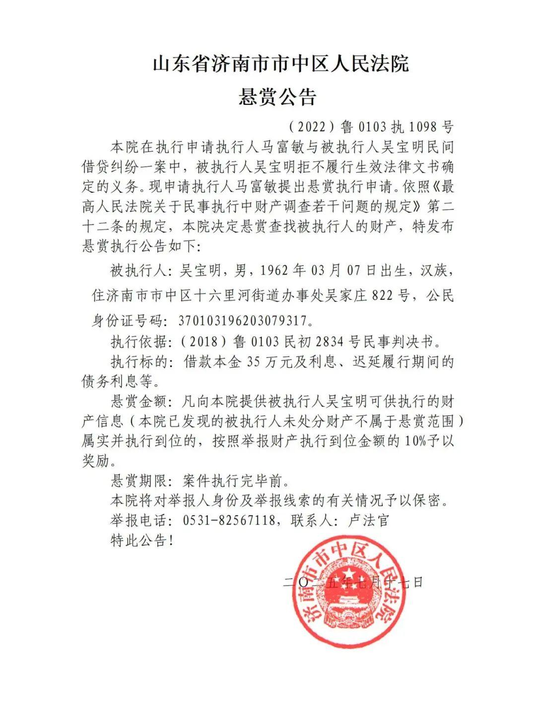 本院在執(zhí)行申請執(zhí)行人馬富敏與被執(zhí)行人吳寶明民間借貸糾紛一案中,被執(zhí)行人吳寶明拒不履行生效法律文書確定的義務(wù)?,F(xiàn)申請執(zhí)行人馬富敏提出懸賞執(zhí)行申請。依照《最高人民法院關(guān)于民事執(zhí)行中財產(chǎn)調(diào)查若干問題的規(guī)定》第二十二條的規(guī)定,本院決定懸賞查找被執(zhí)行人的財產(chǎn),特發(fā)布懸賞執(zhí)行公告如下: