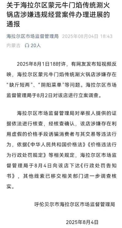 8月2日,海拉爾區(qū)市場監(jiān)管局也展開立案調(diào)查。最新通報(bào)顯示,8月4日,內(nèi)蒙古呼倫貝爾市海拉爾區(qū)市場監(jiān)督管理局針對涉事火鍋店涉嫌違規(guī)經(jīng)營一案向該店下達(dá)了《行政處罰告知書》。