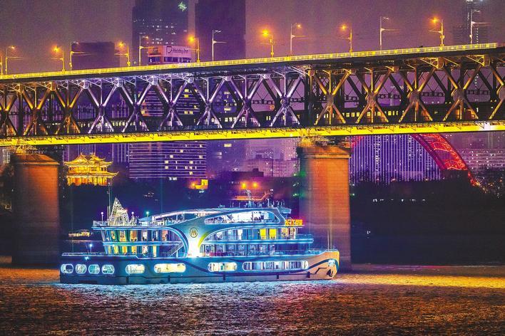 游客乘坐長江榮耀號(hào)游輪欣賞江城夜景。