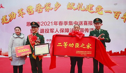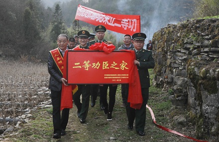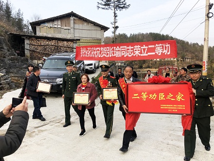 圖為軍地領導將立功喜報及牌匾送往立功官兵家中。彭磊 攝