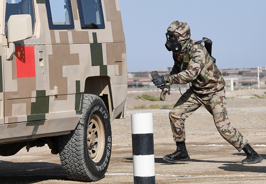 圖為中國陸軍參賽隊通過炸點路段。張永進 攝