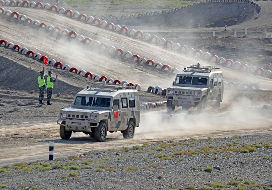 圖為中國陸軍參賽隊和烏茲別克斯坦參賽隊駕駛車輛飛速行進。羅興倉 攝