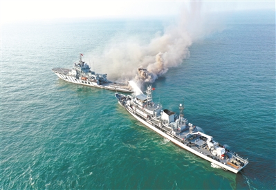獲得目標(biāo)方位后,打撈救生船立即從上風(fēng)向抵近“戰(zhàn)損”艦艇?!按蜷_水炮!”隨著指揮員一聲令下,“水龍”瞬間噴涌而出,成功壓制火勢(shì)。與此同時(shí),兩條搜救艇從打撈救生船右舷吊放入水,在直升機(jī)引導(dǎo)下,向“落水人員”快速駛?cè)ァ?/p>