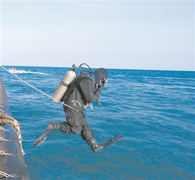 圖②:潛水員躍入水中,營救“落水人員”。