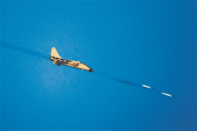 圖①:北部戰(zhàn)區(qū)海軍航空兵某旅組織戰(zhàn)術(shù)射擊訓(xùn)練,檢驗飛行員低空機動突防能力。圖為戰(zhàn)機俯沖向目標發(fā)射火箭彈。張越 攝