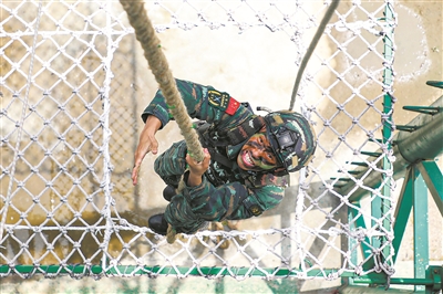 圖①:武警廣西總隊河池支隊特戰(zhàn)隊員進行攀登抓繩上訓(xùn)練??忧?攝