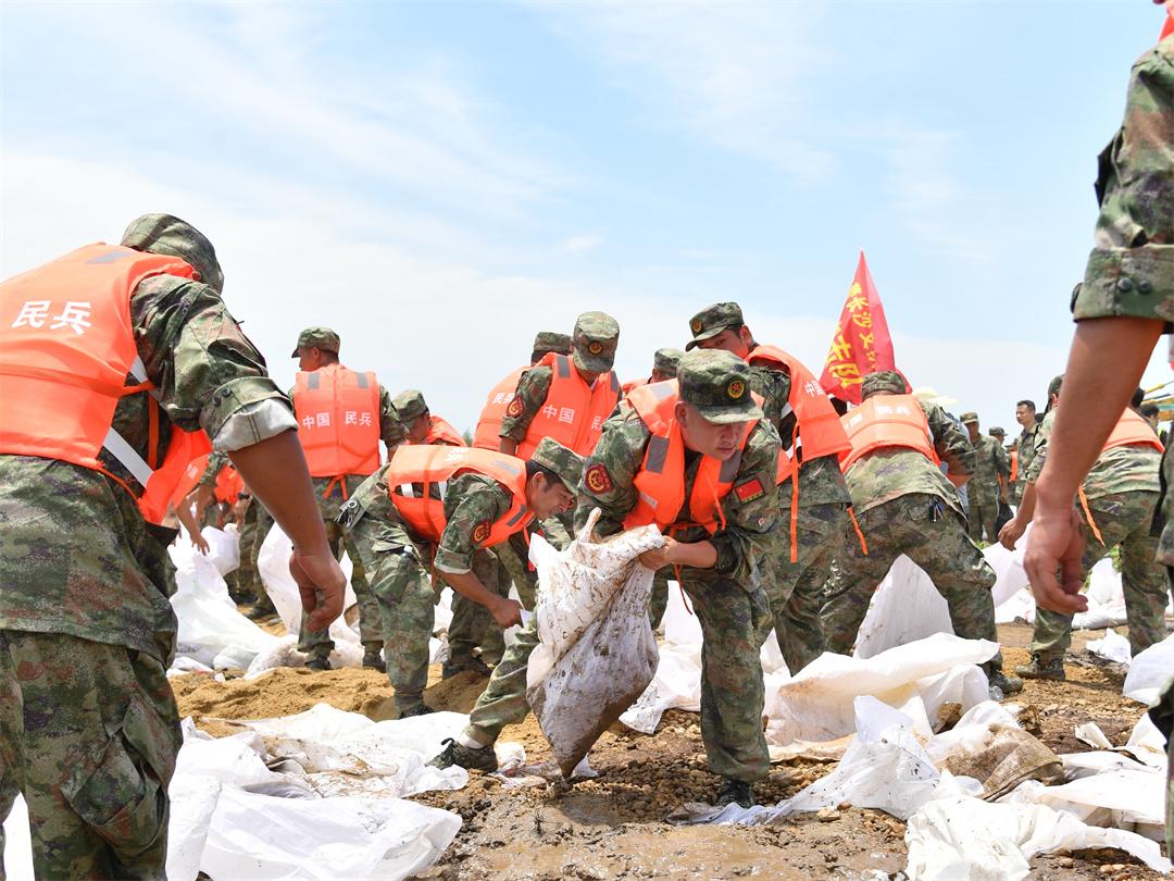在專家指導(dǎo)下,經(jīng)過軍地?fù)岆U(xiǎn)人員緊急處置,7月8日13時(shí),管涌險(xiǎn)情得到初步控制。放眼望去,官兵和民兵們沖鋒的身影構(gòu)筑起一道“迷彩長(zhǎng)堤”。