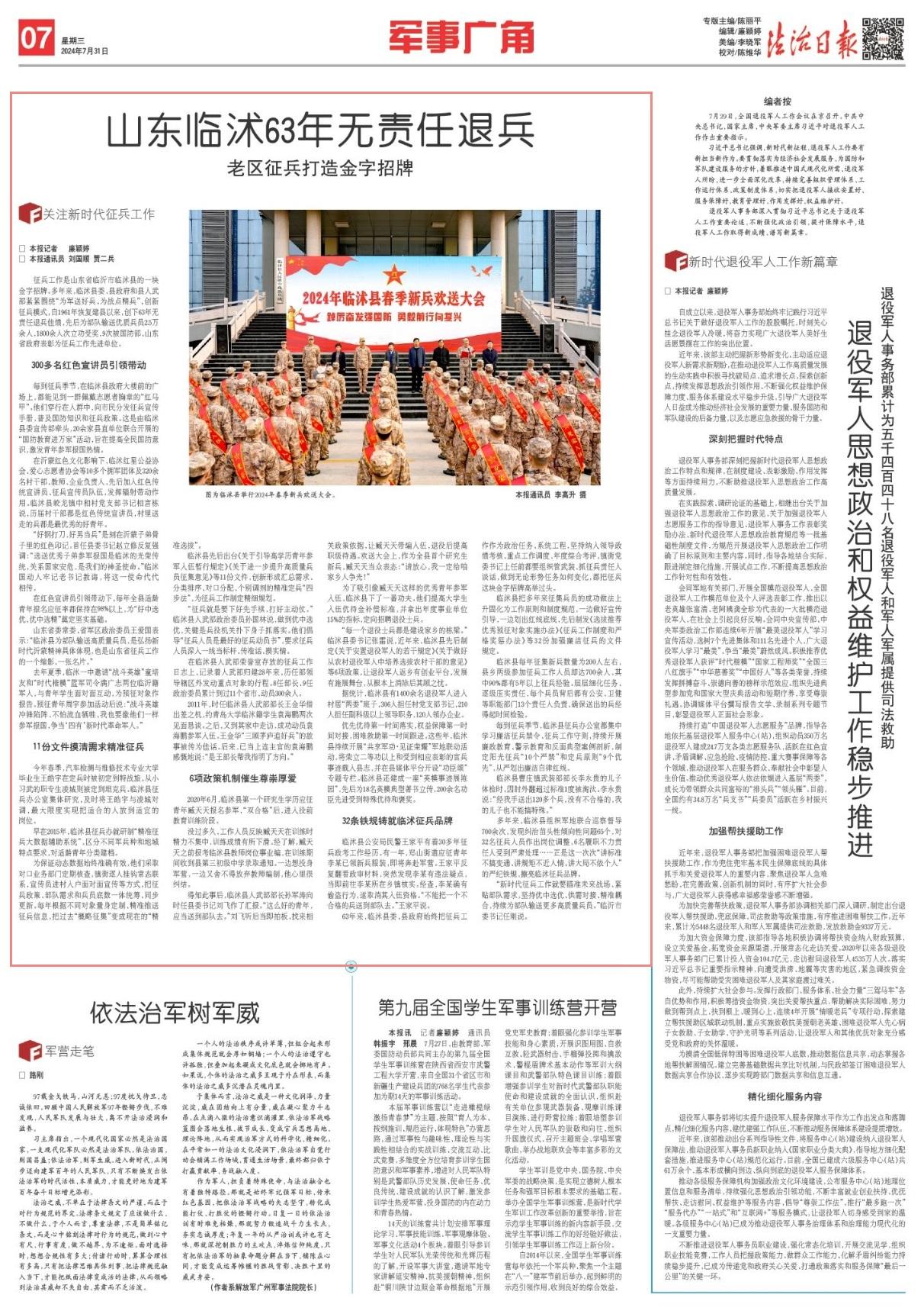 優(yōu)先優(yōu)待第一時(shí)間落實(shí),權(quán)益保障第一時(shí)間對接,困難救助第一時(shí)間跟進(jìn)。這些年,臨沭縣持續(xù)開展“共享軍功·見證榮耀”軍地聯(lián)動(dòng)活動(dòng),將榮立二等功以上和受到相應(yīng)表彰的官兵事跡載入縣志,并在縣媒體平臺開設(shè)“功臣頌”專題專欄。臨沭縣還建成一座“英模事跡展陳園”,先后為18名英模典型著書立傳,200余名功臣先進(jìn)受到特殊優(yōu)待和褒獎(jiǎng)。