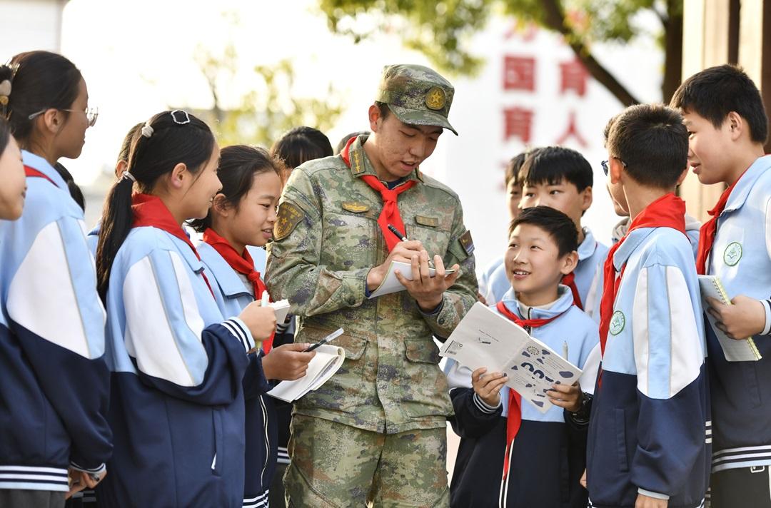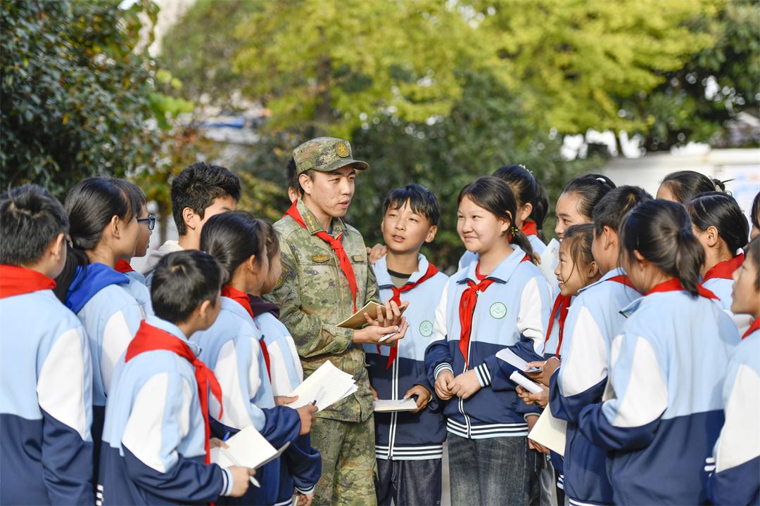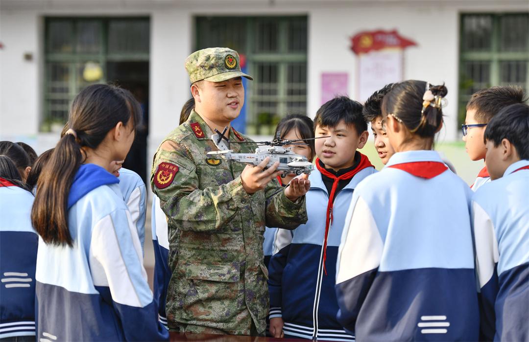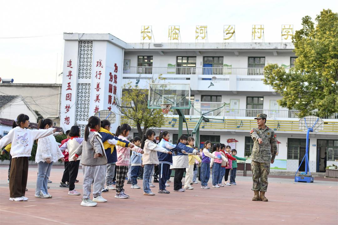 圖為在肥東縣長(zhǎng)臨河學(xué)校中心小學(xué),某部指導(dǎo)員魏力源和孩子們?cè)谝黄稹?/span>