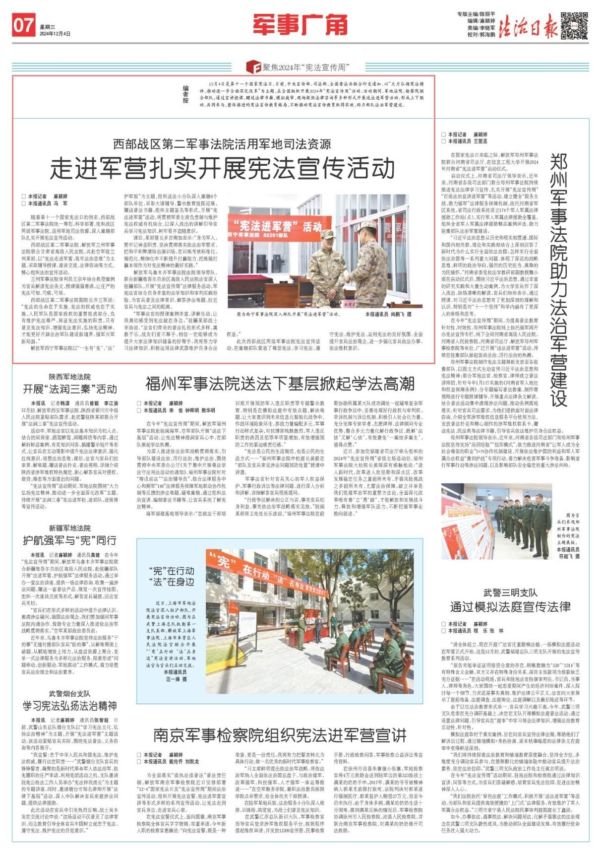 12月4日是第十一個國家憲法日,日前,中央宣傳部、司法部、全國普法辦聯(lián)合印發(fā)通知,以“大力弘揚憲法精神,推動進一步全面深化改革”為主題,在全國組織開展2024年“憲法宣傳周”活動?;顒悠陂g,軍地法院、檢察院聯(lián)合部隊,通過宣講授課、贈送法律書籍、模擬庭審、現(xiàn)場提供法律咨詢等多種形式開展送法進軍營活動,形成上下聯(lián)動、共同參與、整體推進的憲法宣傳教育格局,不斷推動憲法宣傳教育取得實效,助力部隊法治軍營建設(shè)。