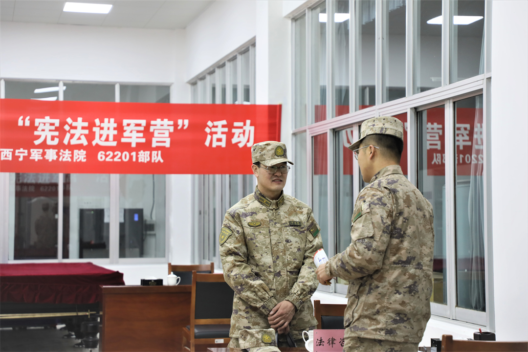 解放軍西寧軍事法院以“一生有‘憲’,‘法’護軍旅”為主題,組織送法小分隊深入案轄6個部隊單位,采取大課輔導(dǎo)、警示教育掛圖巡展、贈送普法書籍、組織主題簽名等形式,開展“憲法進軍營”活動,將貫徹軍委主席負(fù)責(zé)制與維護憲法權(quán)威有機結(jié)合,以深入淺出的講解引導(dǎo)官兵學(xué)習(xí)憲法知識,樹牢看齊追隨意識。