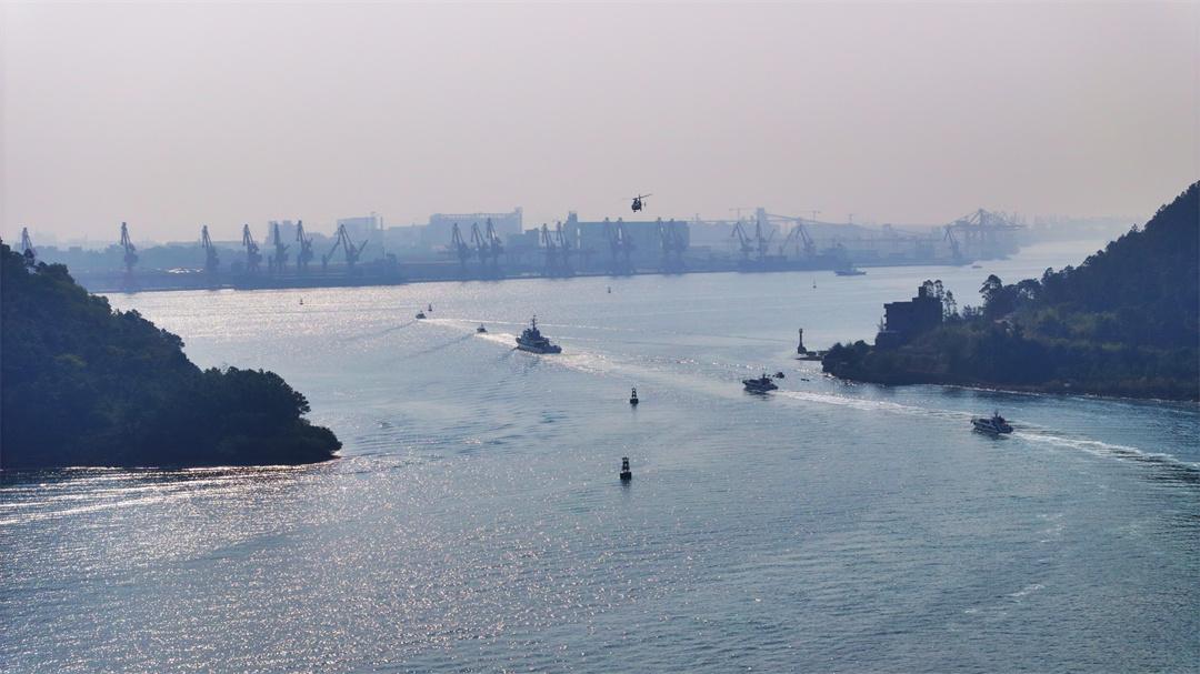 圖為直升機(jī)掠過(guò)艦艇上方。蘇杰 攝