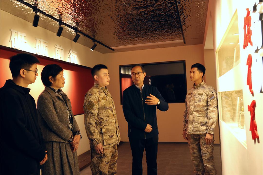 圖為全國(guó)愛國(guó)擁軍模范黃金國(guó)(右二)參觀大榭島雙擁展覽館。
