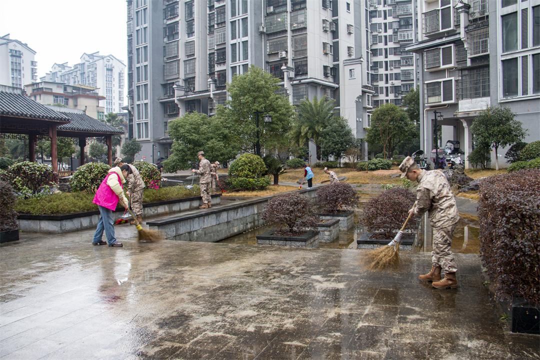 圖為武警官兵與志愿者一起清理社區(qū)衛(wèi)生。