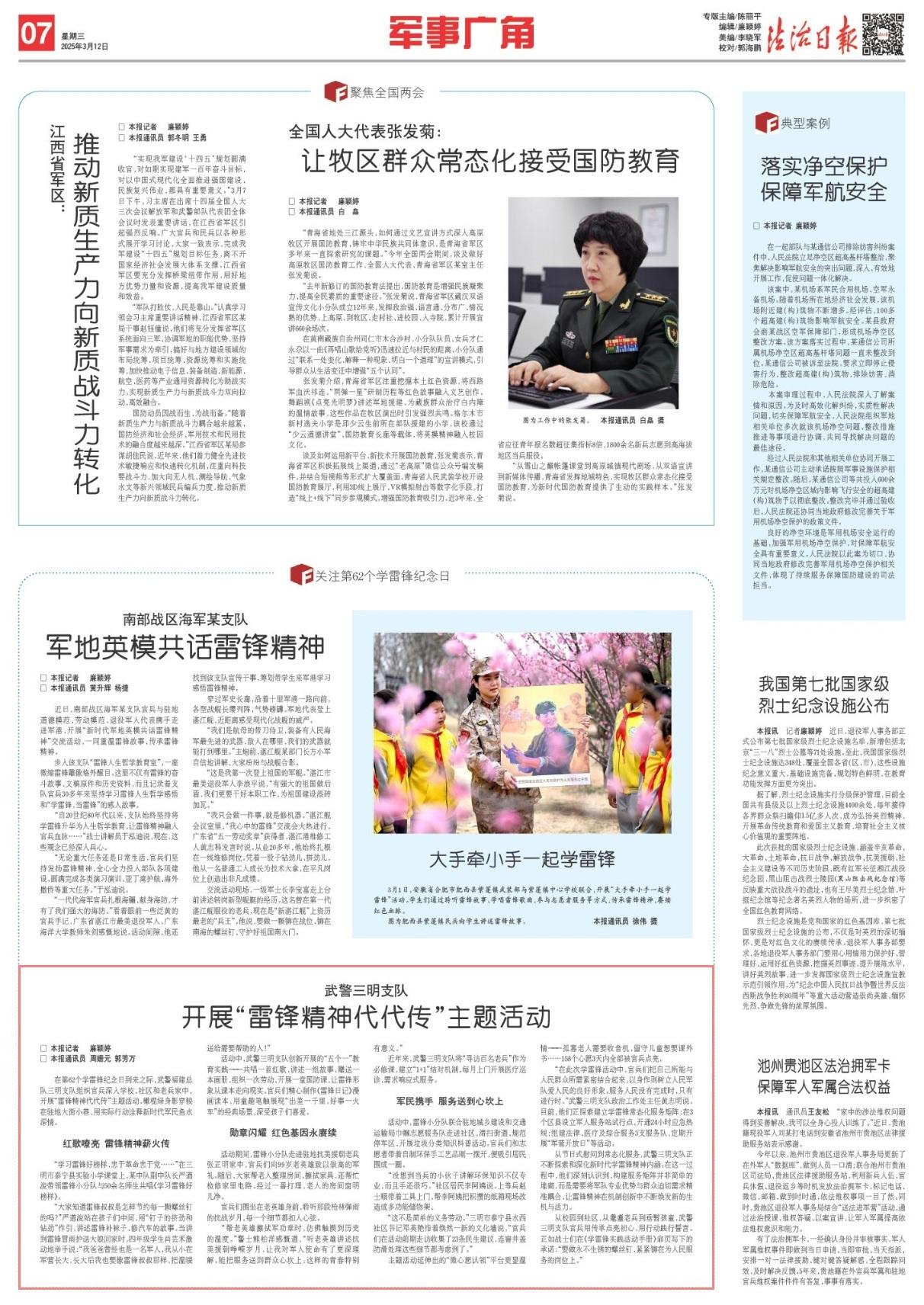 在第62個(gè)學(xué)雷鋒紀(jì)念日到來(lái)之際,武警福建總隊(duì)三明支隊(duì)組織官兵深入學(xué)校、社區(qū)和老兵家中,開(kāi)展“雷鋒精神代代傳”主題活動(dòng)。橄欖綠身影穿梭在駐地大街小巷,用實(shí)際行動(dòng)詮釋新時(shí)代軍民魚(yú)水深情。