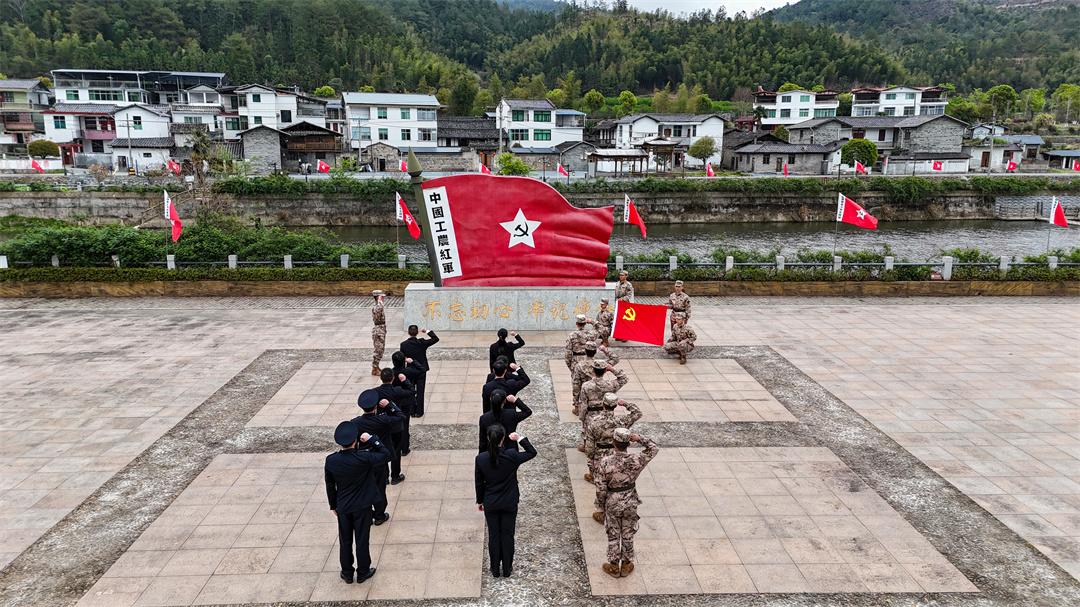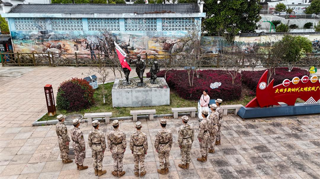 在大田鄉(xiāng)少年紅軍文化廣場,中國工農(nóng)紅軍軍旗雕塑巍然矗立,黨員干部和官兵們整齊列隊,重溫入黨誓詞。