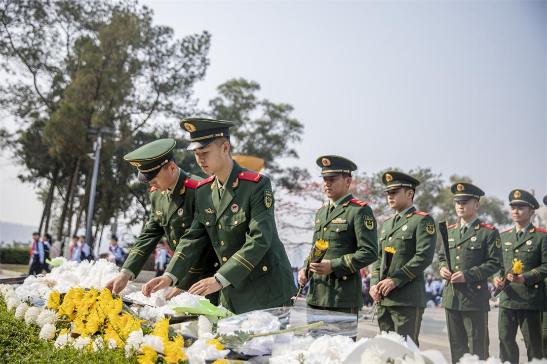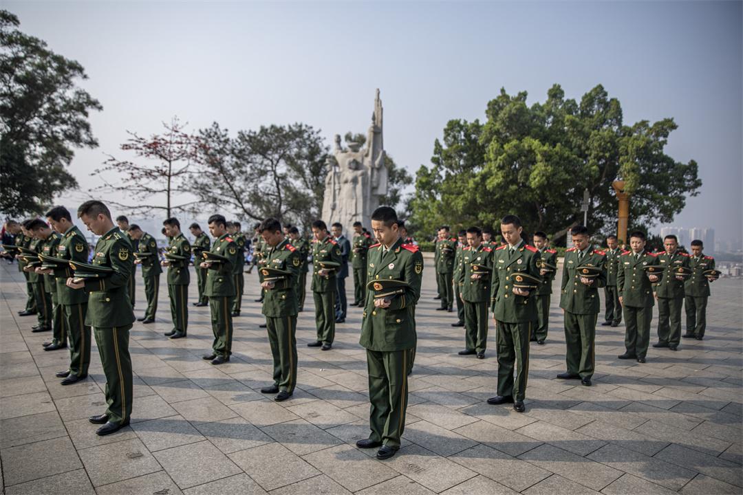 圖為官兵依次向革命烈士敬獻(xiàn)鮮花。溫博 攝