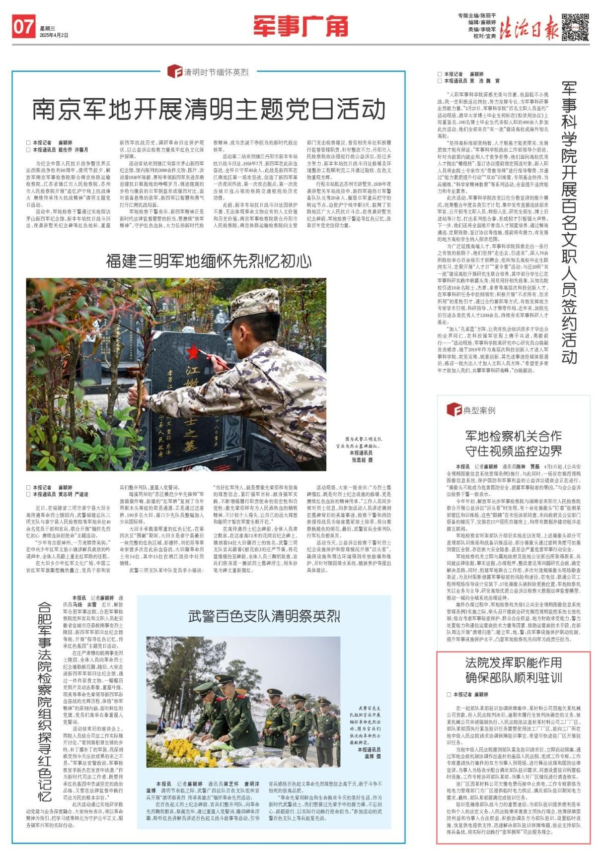 駐訓(xùn)是錘煉部隊戰(zhàn)斗力的重要途徑,為部隊駐訓(xùn)提供便利是單位和個人的法定義務(wù)。人民法院秉承善意文明執(zhí)行理念,統(tǒng)籌保障國防利益和當事人合法權(quán)益,積極協(xié)調(diào)各方為部隊駐訓(xùn)、設(shè)置臨時設(shè)施、恢復(fù)供電提供支持,迅速解決部隊駐訓(xùn)保障難題,依法支持部隊練兵備戰(zhàn),用實際行動踐行“崇軍擁軍”司法服務(wù)理念。