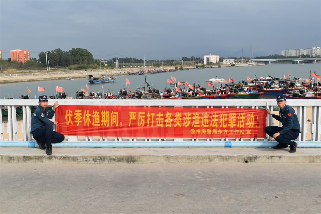 圖為執(zhí)法員懸掛伏季休漁橫幅標(biāo)語。