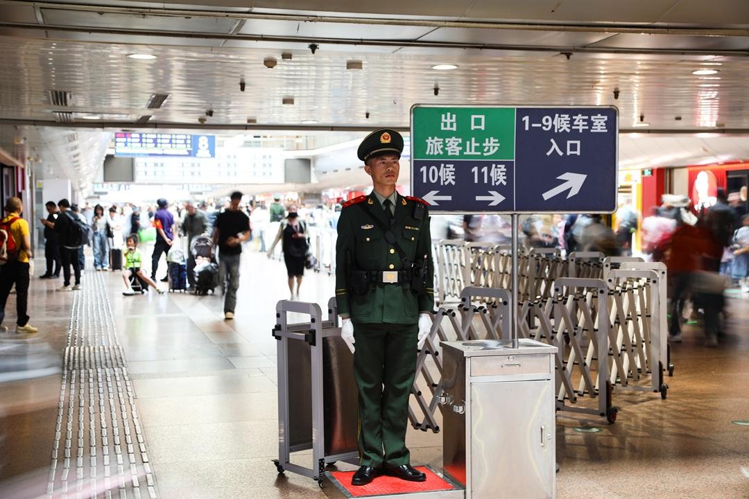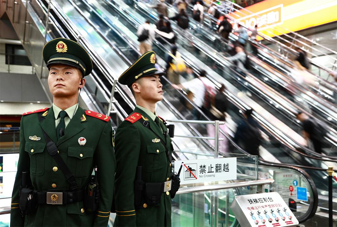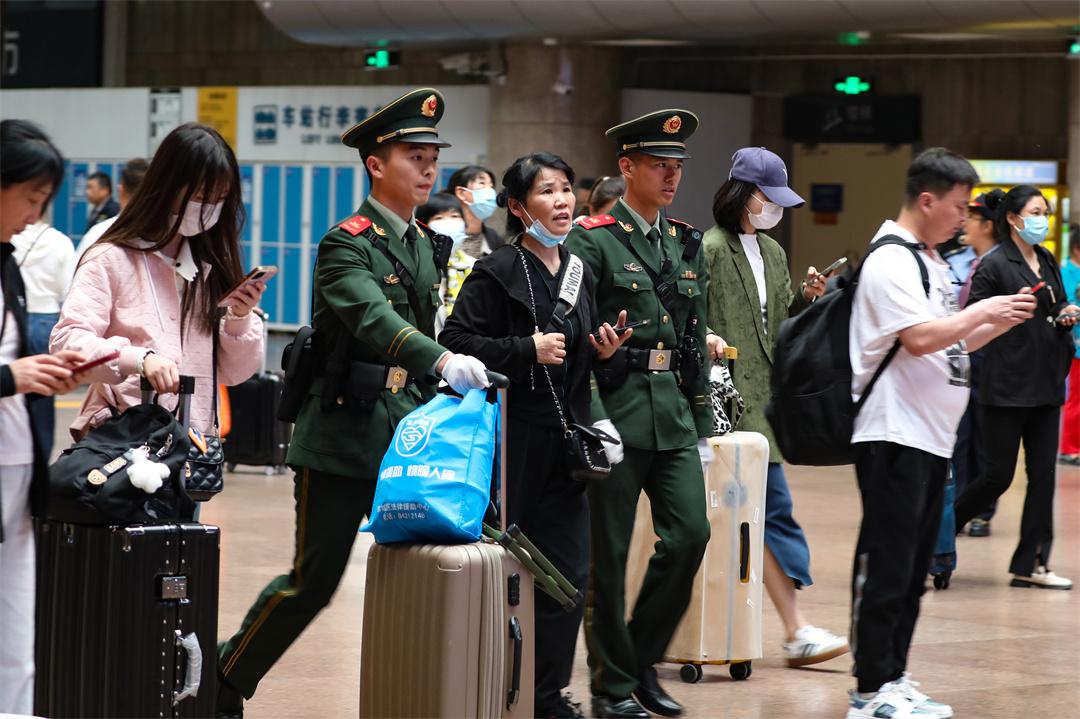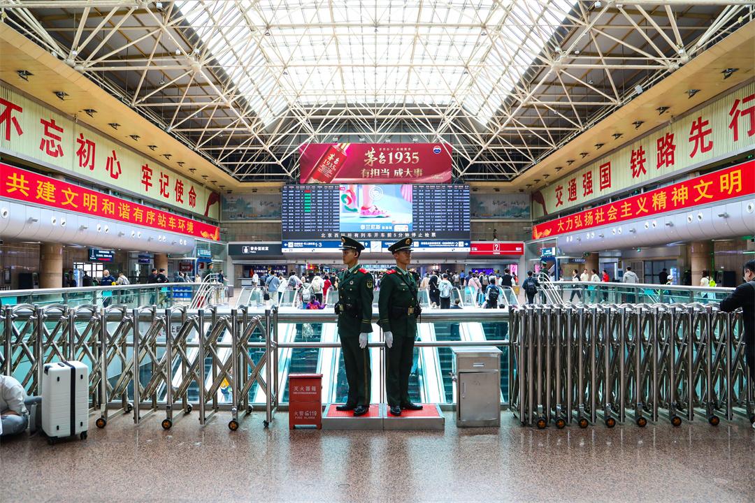 今年五一假期,北京地區(qū)迎來雙向出行高峰,各大交通樞紐客流激增。假期首日,北京西站客流量近40萬人次,擔負北京西站守衛(wèi)任務的武警北京總隊執(zhí)勤第六支隊官兵堅守執(zhí)勤崗位,熱心為旅客提供幫助,全力守護旅客平安出行。