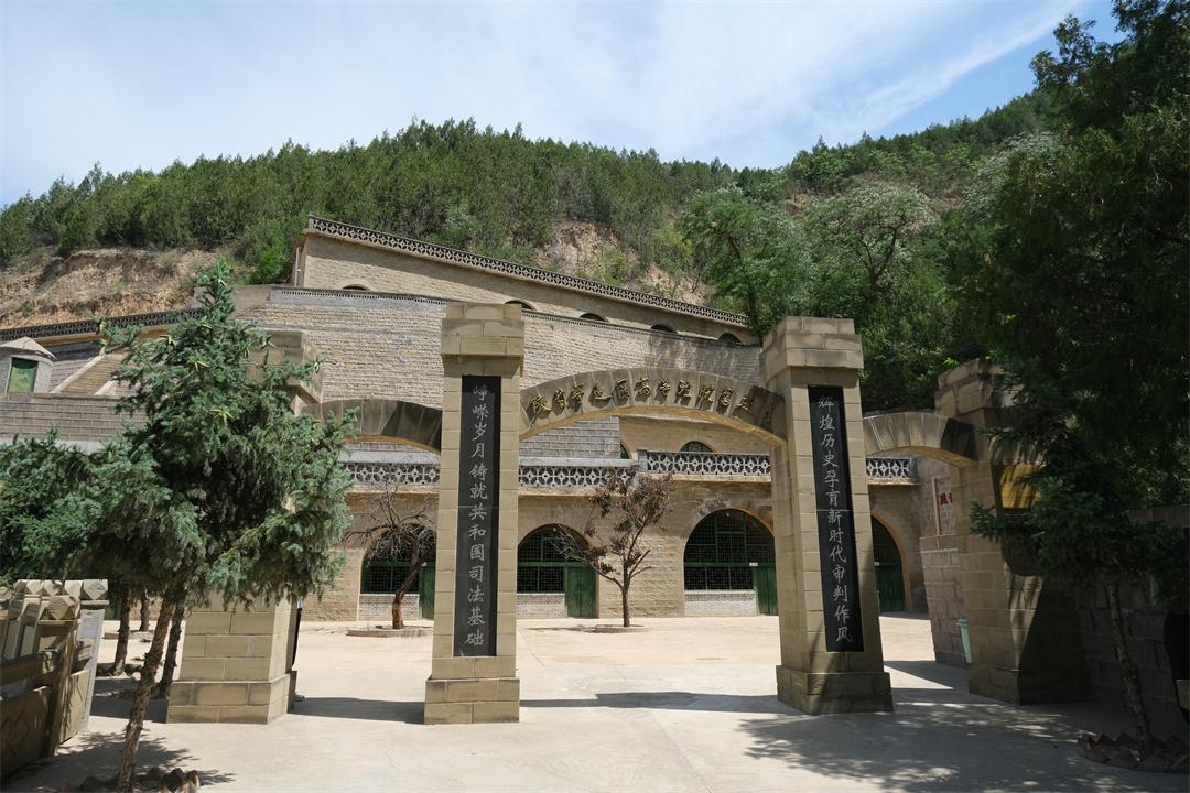拾級而上,山頂一座莊嚴肅穆的三孔石拱門映入眼簾,“陜甘寧邊區(qū)高等法院舊址”11個鎦金大字在石拱門正中,兩側(cè)題寫“崢嶸歲月鑄就共和國司法基礎(chǔ) 輝煌歷史孕育新時代審判作風”。
