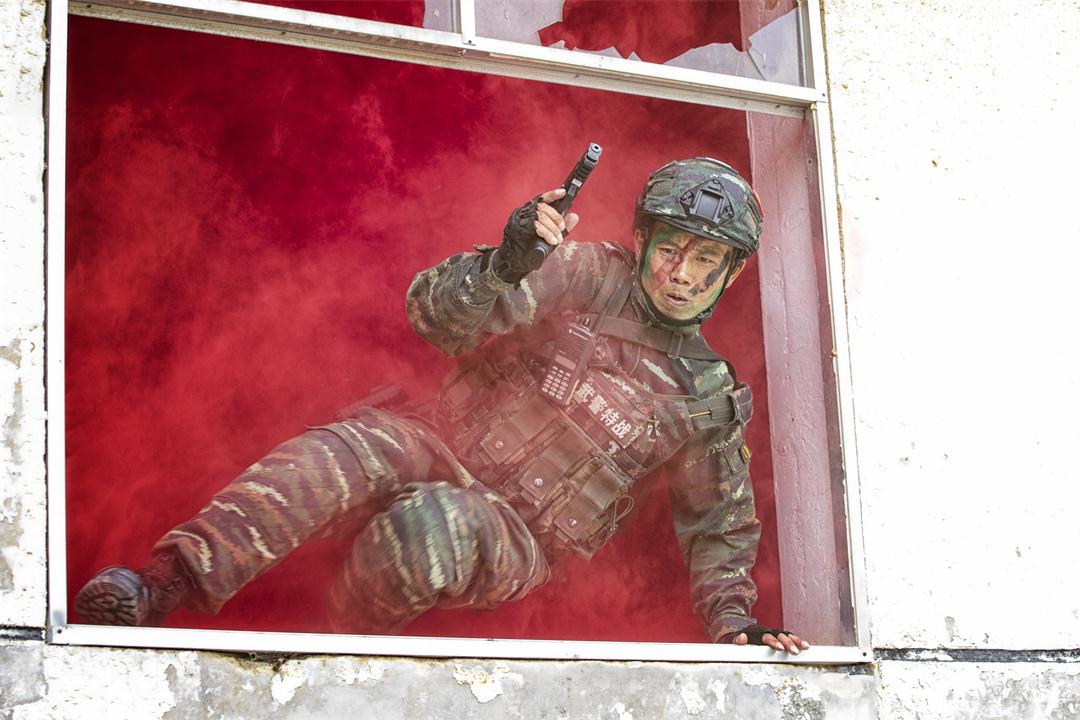 夕陽把訓(xùn)練場攀登樓拉出長長的影子,李興坤正在示范索降技巧。老兵身手敏捷,如同巖羊般靈巧,從18米高的樓上瞬間落地。
