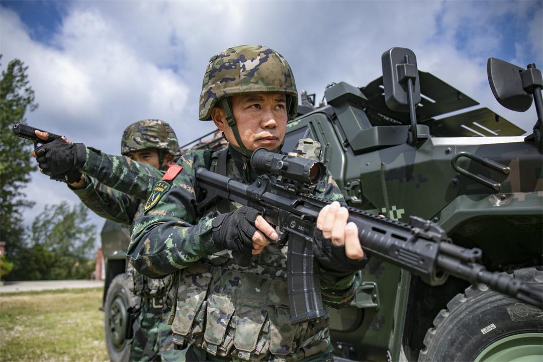 圖為李興坤(中)帶領(lǐng)小隊(duì)進(jìn)行山林地捕殲戰(zhàn)斗演練。