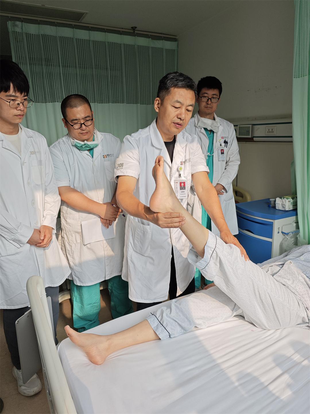 圖為張雪松主任團(tuán)隊(duì)查看患者術(shù)后恢復(fù)情況,叮囑康復(fù)注意事項(xiàng)。