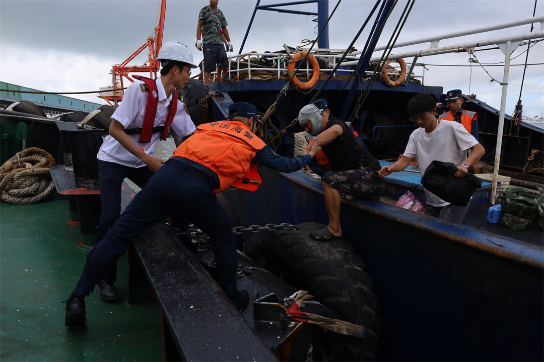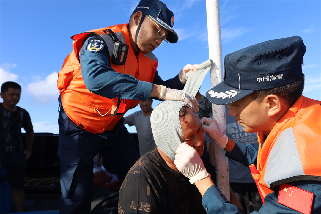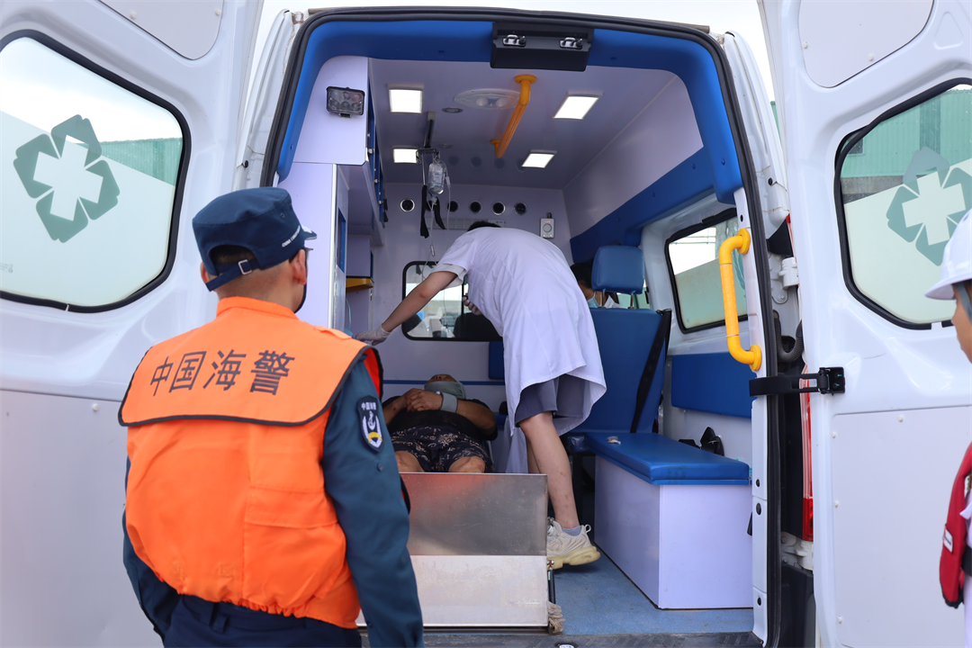 中國海警局直屬第三局橫琴艦接警后立即組織航渡救援,克服夜航能見度較差以及2米海浪的惡劣海況,快速馳援。抵達(dá)現(xiàn)場后,橫琴艦兩名海警醫(yī)務(wù)人員對傷員迅速進(jìn)行救治,實施止血包扎、口服補(bǔ)液等緊急醫(yī)療措施,及時有效穩(wěn)定了傷員狀況。