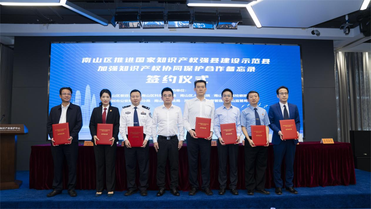 簽約儀式上,南山區(qū)委政法委、南山區(qū)科技創(chuàng)新局、南山區(qū)人民法院、南山區(qū)人民檢察院、南山區(qū)公安分局、南山區(qū)司法局、深圳市市場(chǎng)監(jiān)督管理局南山監(jiān)管局等7家單位共同簽約了《推進(jìn)國(guó)家知識(shí)產(chǎn)權(quán)強(qiáng)縣建設(shè)示范縣 加強(qiáng)知識(shí)產(chǎn)權(quán)協(xié)同保護(hù)合作備忘錄》(以下簡(jiǎn)稱《合作備忘錄》)。