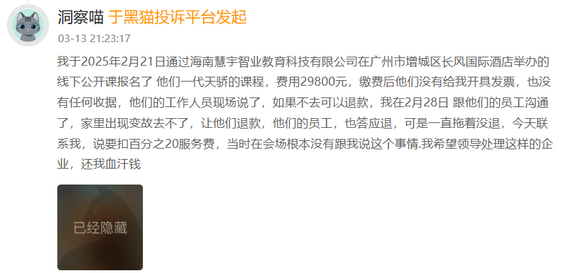此外,在黑貓投訴上有多位消費(fèi)者投訴該類開(kāi)設(shè)課程機(jī)構(gòu)存在涉嫌偷稅截留、霸王扣款等問(wèn)題。比如,一位女士投訴稱,在廣州報(bào)名公開(kāi)課,現(xiàn)場(chǎng)支付費(fèi)用29800元,繳費(fèi)后機(jī)構(gòu)未開(kāi)發(fā)票,工作人員口頭承諾“不去即退全款”。然而當(dāng)其提出因計(jì)劃有變申請(qǐng)退款時(shí),機(jī)構(gòu)拖延半月后突然提出“強(qiáng)扣20%服務(wù)費(fèi)”。
