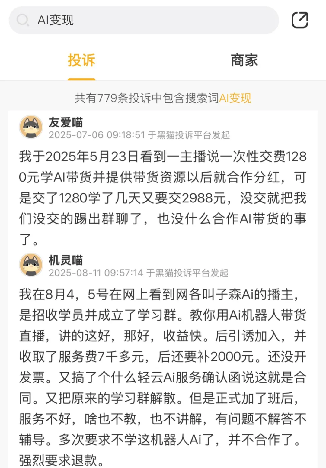 在黑貓投訴平臺上,有關(guān)“AI變現(xiàn)”的投訴已達(dá)700多條。不少投訴者提到,購買課程后不僅沒學(xué)到實(shí)質(zhì)內(nèi)容,還被商家誘導(dǎo)二次消費(fèi),一旦拒絕二次消費(fèi),就會(huì)被直接踢出交流群。