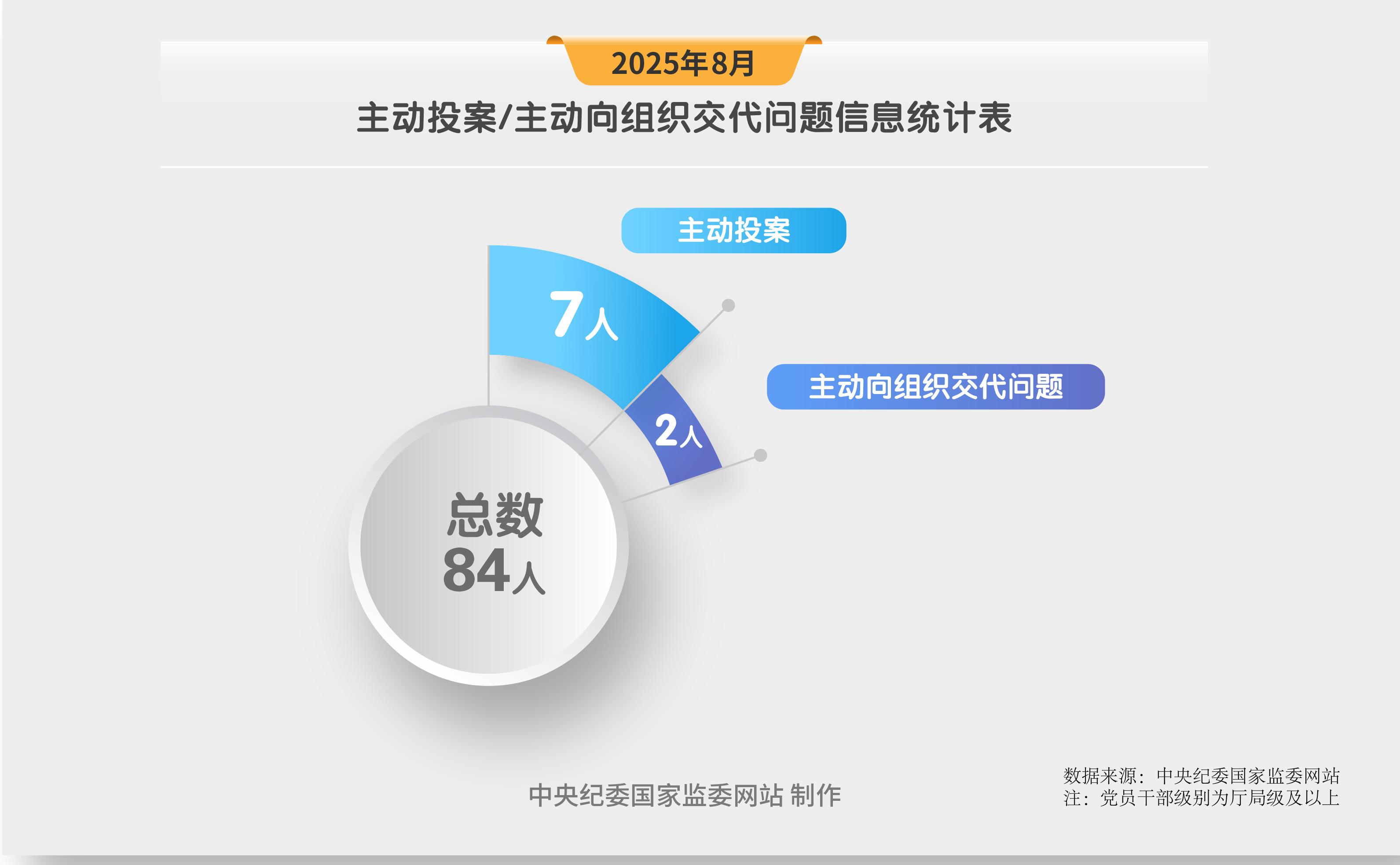 2025年8月,中央紀(jì)委國家監(jiān)委網(wǎng)站發(fā)布的審查調(diào)查信息中,7名黨員領(lǐng)導(dǎo)干部主動投案,2名黨員領(lǐng)導(dǎo)干部主動向組織交代問題。