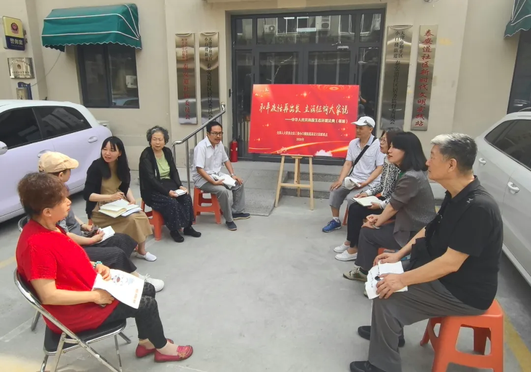 “和平夜話再出發(fā),立法征詢大家說(shuō)”,天津小白樓街道基層立法聯(lián)系點(diǎn)到社區(qū)征集對(duì)生態(tài)環(huán)境法典(草案)的意見(jiàn)。(全國(guó)人大常委會(huì)法工委供圖)