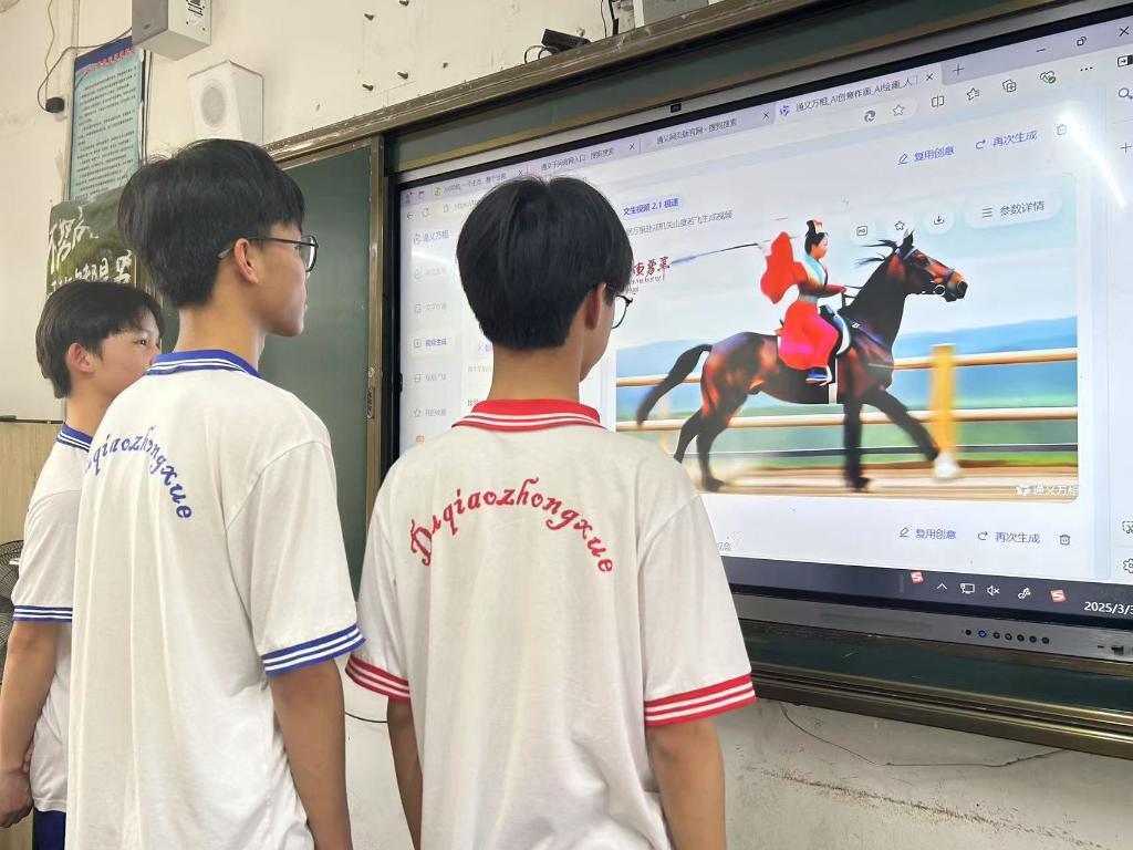 3月3日,廣西容縣容州鎮(zhèn)都嶠中學(xué)學(xué)生觀看老師使用人工智能大模型生成的海報,感受語文課堂的互動創(chuàng)新。(陳春仲 攝)