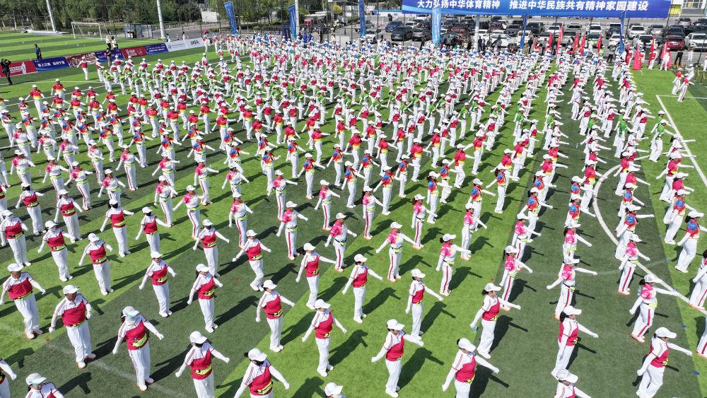 2025年6月10日,群眾在寧夏銀川市金鳳區(qū)覽山公園參加千人健身操展演(無(wú)人機(jī)照片)。當(dāng)日,紀(jì)念“發(fā)展體育運(yùn)動(dòng) 增強(qiáng)人民體質(zhì)”題詞73周年全民健身主題活動(dòng)在覽山公園舉行。