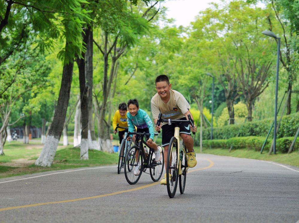 2025年8月5日,小朋友在四川成都錦城湖公園內騎行。