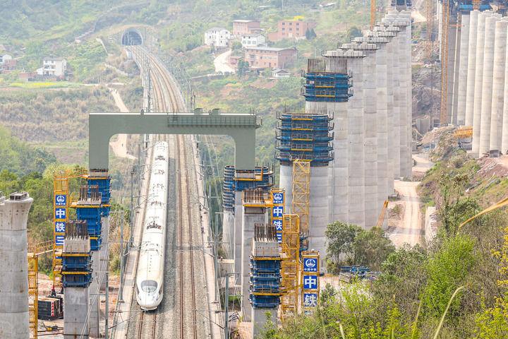 2025年3月27日,在成達萬高鐵左線福壽跨渝萬城際特大橋項目施工現(xiàn)場,成達萬高鐵首個跨既有高鐵鋼橫梁吊裝完成,鄭渝高鐵線上一列動車從門式墩鋼橫梁下通過。新華社發(fā)(黃茂程攝)