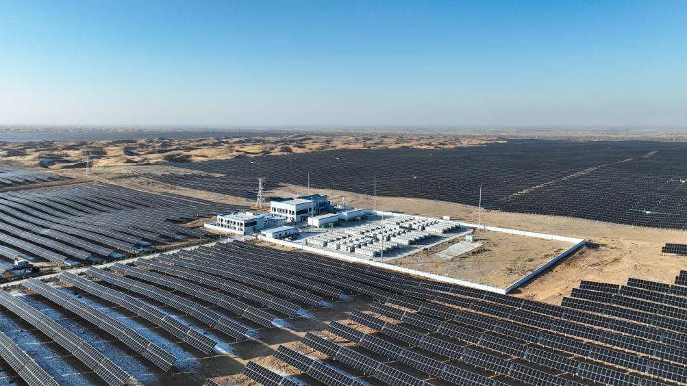 昔日“黃沙遮天日,飛鳥無(wú)棲樹”的沙海中,一排排藍(lán)色光伏板在陽(yáng)光照耀下熠熠生輝,將熾熱陽(yáng)光轉(zhuǎn)化為清潔電能。板下沙地中,沙柳、檸條等沙生植物茂密生長(zhǎng)。