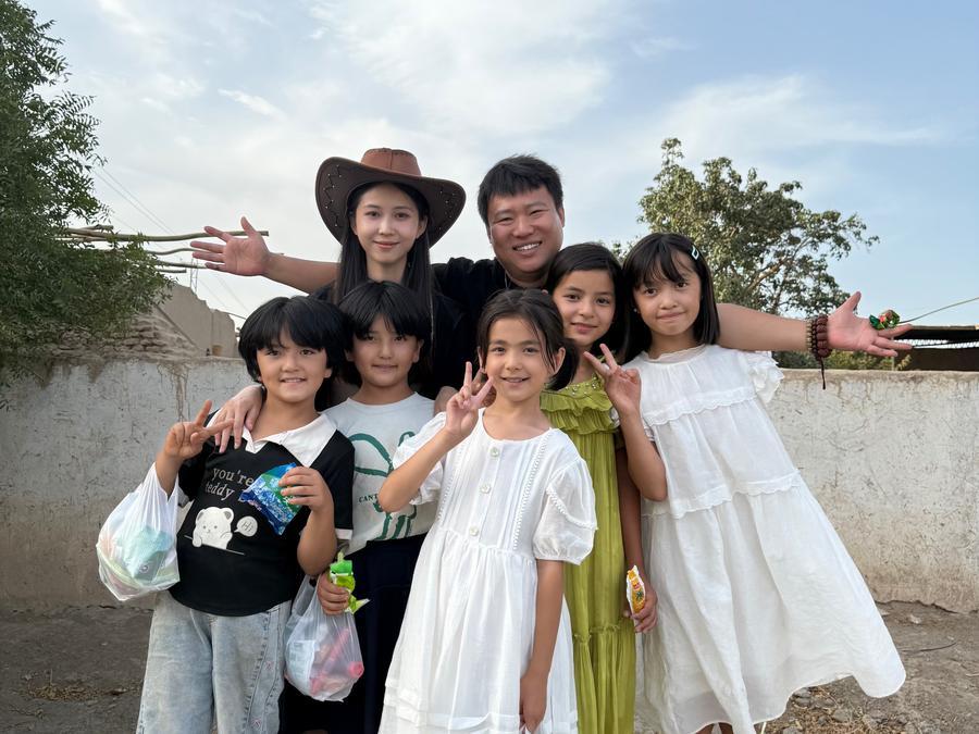 和田縣的小學(xué)生們?cè)谔彀查T背景布前合影。(受訪者供圖)