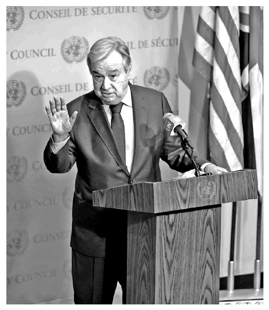 圖① 當(dāng)?shù)貢r(shí)間3月10日,聯(lián)合國(guó)秘書長(zhǎng)古特雷斯在聯(lián)合國(guó)總部舉行的敘利亞危機(jī)爆發(fā)10周年記者會(huì)上發(fā)表講話。 CFP供圖
