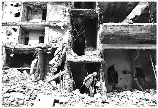 圖② 當(dāng)?shù)貢r(shí)間3月11日,敘利亞霍姆斯老人哈迪·古松走在被炸毀的建筑里。 新華社發(fā)
