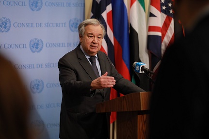 聯(lián)合國(guó)秘書(shū)長(zhǎng)古特雷斯在記者會(huì)上發(fā)言。新華社記者 謝鍔 攝