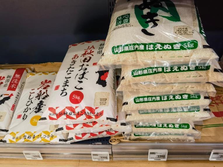 這是2024年7月26日在日本東京一家連鎖超市拍攝的貨架上的大米(手機(jī)照片)。新華社記者鐘雅攝