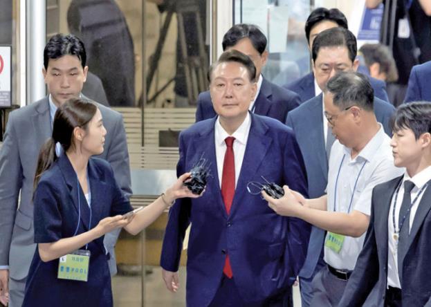 圖為7月9日晚,韓國(guó)前總統(tǒng)尹錫悅接受訊問(wèn)后走出首爾中央地方法院。新華社發(fā)
