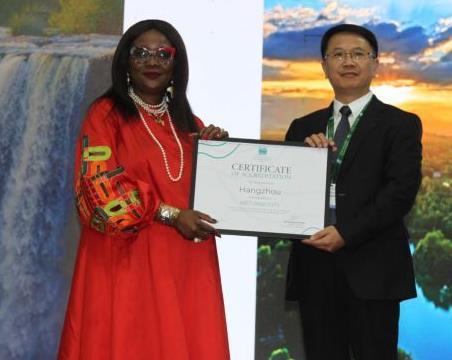 7月24日,在津巴布韋維多利亞瀑布城開幕的《濕地公約》第十五屆締約方大會(huì)上,《濕地公約》秘書長穆松達(dá)·蒙巴為中國浙江杭州代表頒發(fā)“國際濕地城市”證書。新華社發(fā)(塔法拉攝)