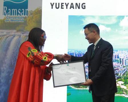 7月24日,在津巴布韋維多利亞瀑布城開幕的《濕地公約》第十五屆締約方大會(huì)上,《濕地公約》秘書長穆松達(dá)·蒙巴為中國湖南岳陽代表頒發(fā)“國際濕地城市”證書。新華社發(fā)(塔法拉攝)